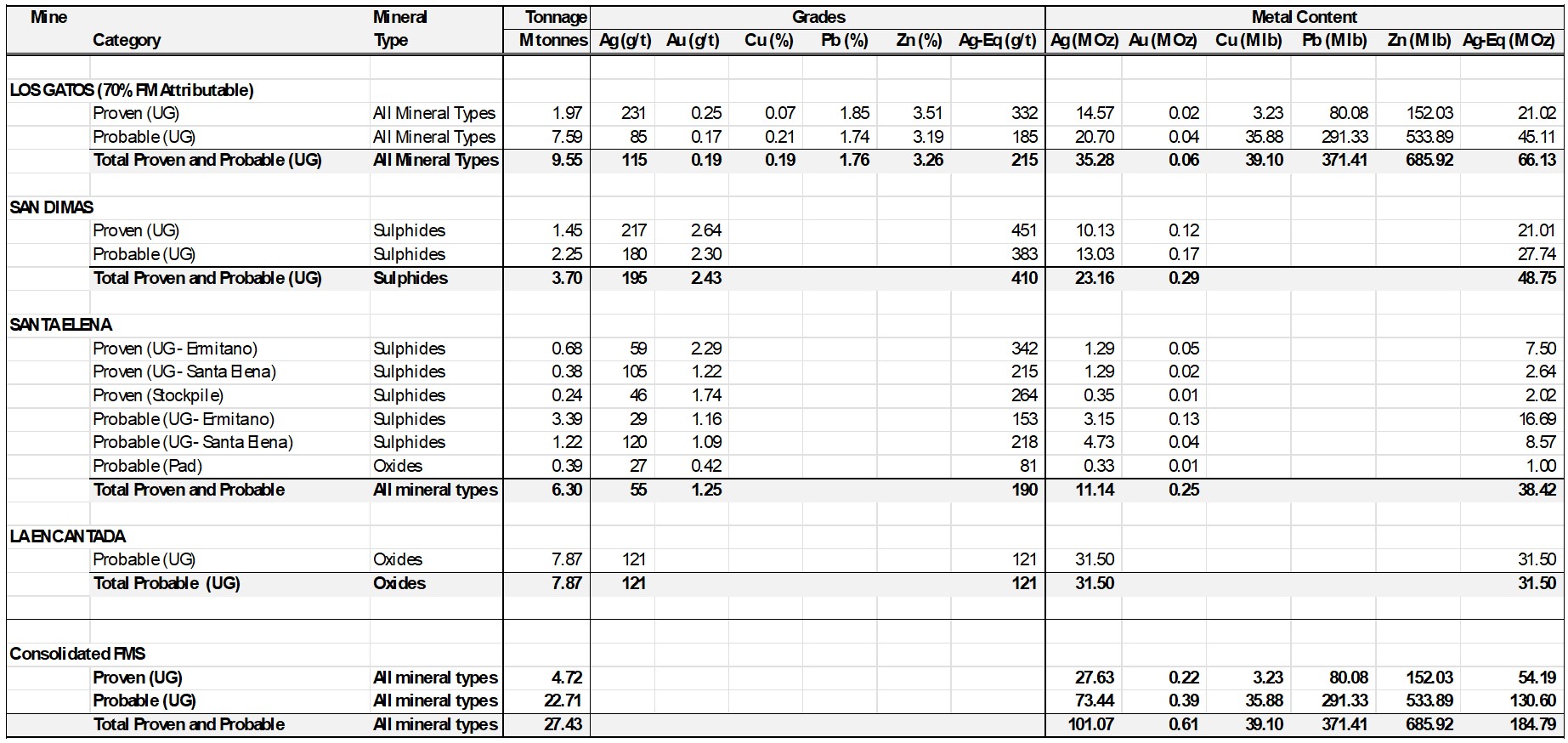 - Metal prices considered for the Mineral Reserve estimates for Santa Elena, San Dimas and La Encantada were $35/oz Ag and $3,100/oz Au; metal prices considered for Los Gatos were $35/oz Ag, $3,100/oz Au, $0.95/lb Pb, $1.25/lb Zn and $4.35/lb Cu.