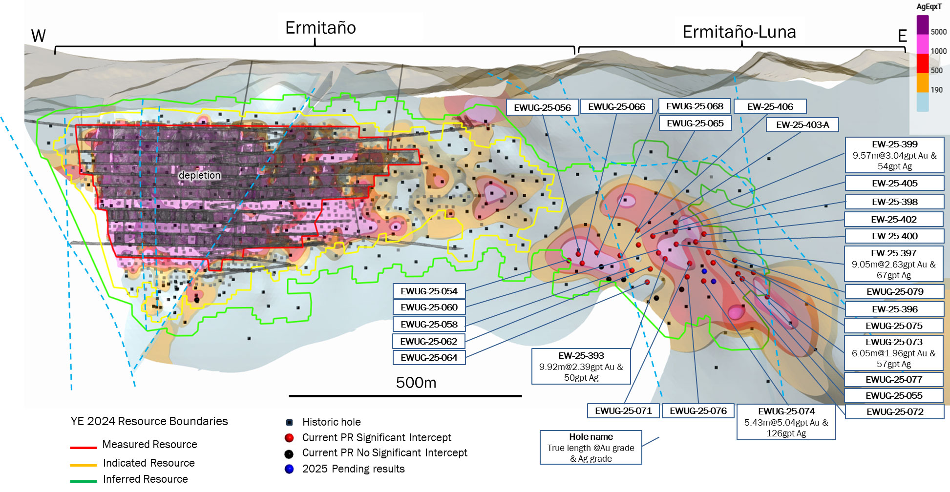 A total of 11,190 m of infill drilling across 33 holes has been completed in 2025 for the Luna Zone of the Ermitaño vein system. Drilling took place from a new underground access ramp and from surface. As a result, the geologic understanding of the Luna portion of the Ermitaño ore body has been greatly enhanced defining a truncation of the Ermitaño vein by the northwest-trending Aitana vein (eastern extension, Figure 6). The drilling is providing geometry, volume and assay results that will be used to convert Inferred Mineral Resources to Indicated Mineral Resources and ultimately to optimize mine development. Precious metal grades and significant intercept thicknesses are tracking closely to those modeled.