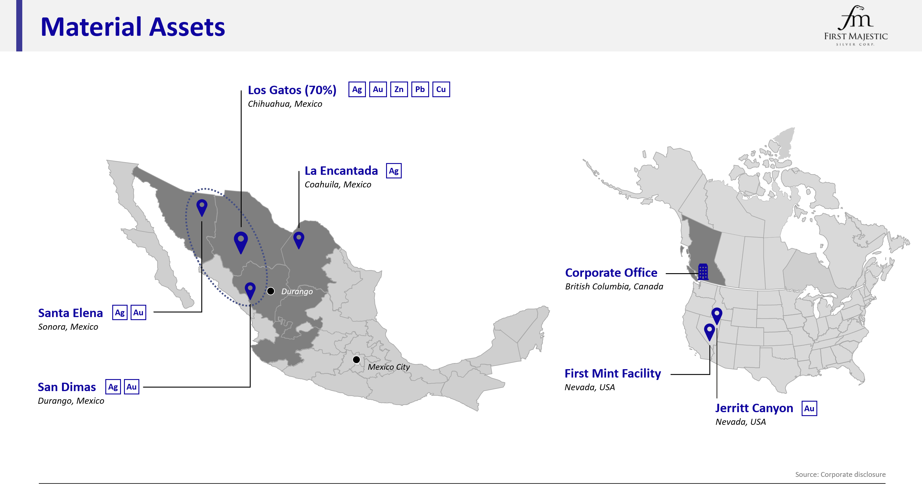 First Majestic is a publicly traded mining company focused on silver and gold production in Mexico and the United States. The Company presently owns and operates four producing underground mines in Mexico: the Santa Elena Silver/Gold Mine, the Los Gatos Silver Mine (the Company holds a 70% interest in the Los Gatos Joint Venture that owns and operates the mine), the San Dimas Silver/Gold Mine, and the La Encantada Silver Mine, as well as a portfolio of development and exploration assets, including the Jerritt Canyon Gold Mine located in northeastern Nevada, U.S.A.
