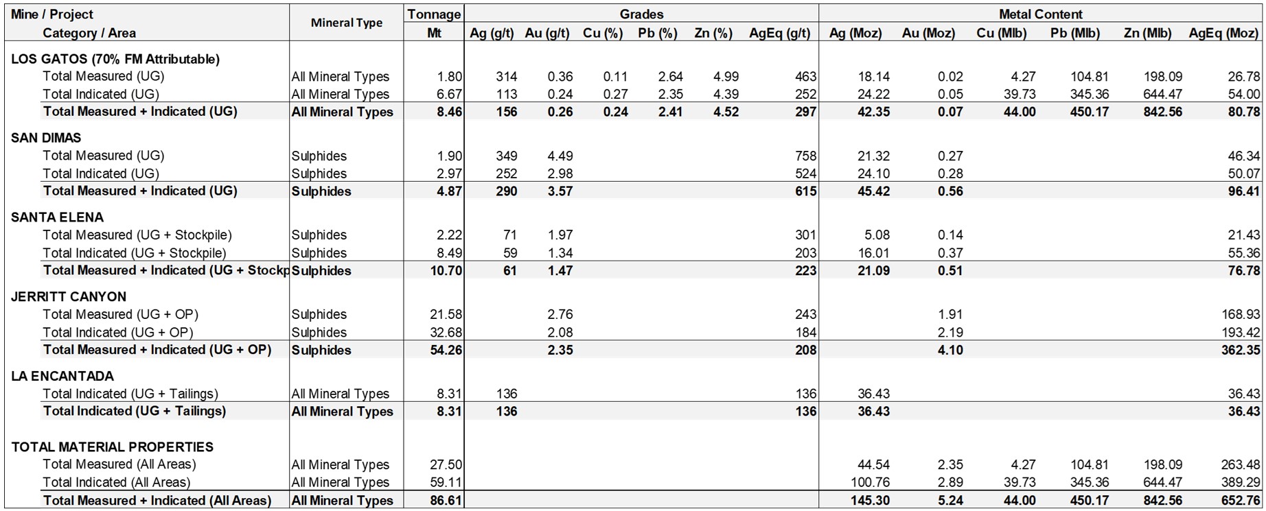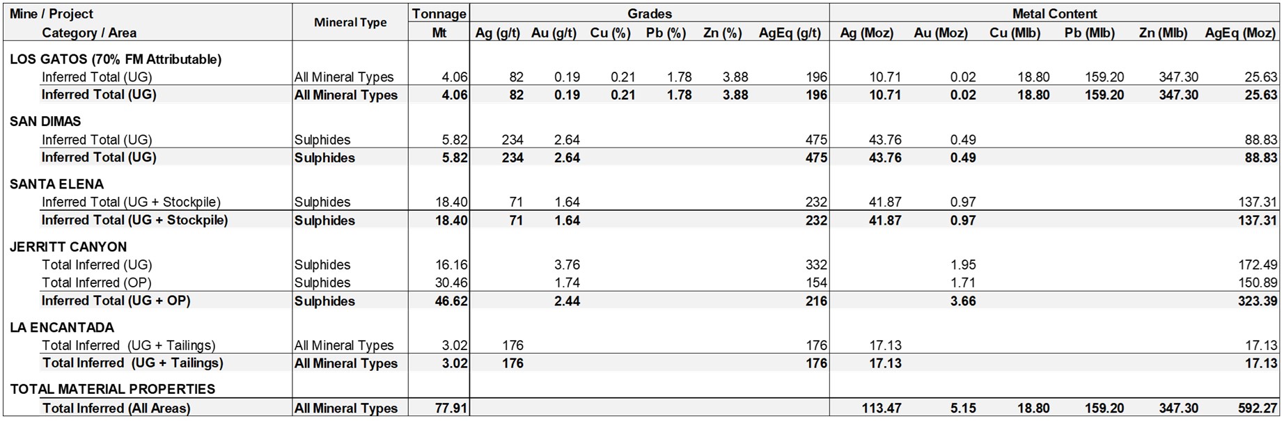 The increase in M&I Mineral Resources was primarily driven by Santa Elena (+25% AgEq ounces year-over-year) and Jerritt Canyon (+116% gold ounces year-over-year). At Jerritt Canyon, higher gold price assumptions and lower cut‑off grades – particularly for lower‑cost bulk‑mining scenarios – expanded mineralization into lower‑grade material, resulting in higher tonnage at lower average grade across both open‑pit and underground resources. - Inferred Mineral Resources increased 69% year‑over‑year (AgEq ounces): Inferred Mineral Resources totalled 77.9 million tonnes containing 592.27 million AgEq ounces, comprised of 113.5 million ounces of silver, 5.2 million ounces of gold, 347.3 million pounds of zinc, 159.2 million pounds of lead, and 18.8 million pounds copper. This represents a 169% increase in tonnes, a 40% increase in silver ounces, a 76% increase in gold ounces, a 103% increase in zinc pounds, an 106% increase in lead pounds and a 168% increase in copper pounds.