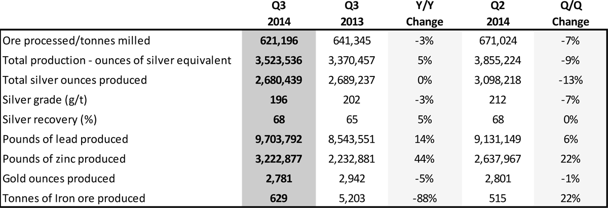Total silver production for the quarter consisted of 2,680,439 ounces of silver, relatively unchanged compared to the same quarter in 2013. In addition, 9,703,792 pounds of lead and 3,222,877 pounds of zinc were produced, representing an increase of 14% and 44%, respectively, compared to the same quarter of the previous year. Also produced were 2,781 ounces of gold, representing a 5% decrease compared to the third quarter of 2013.